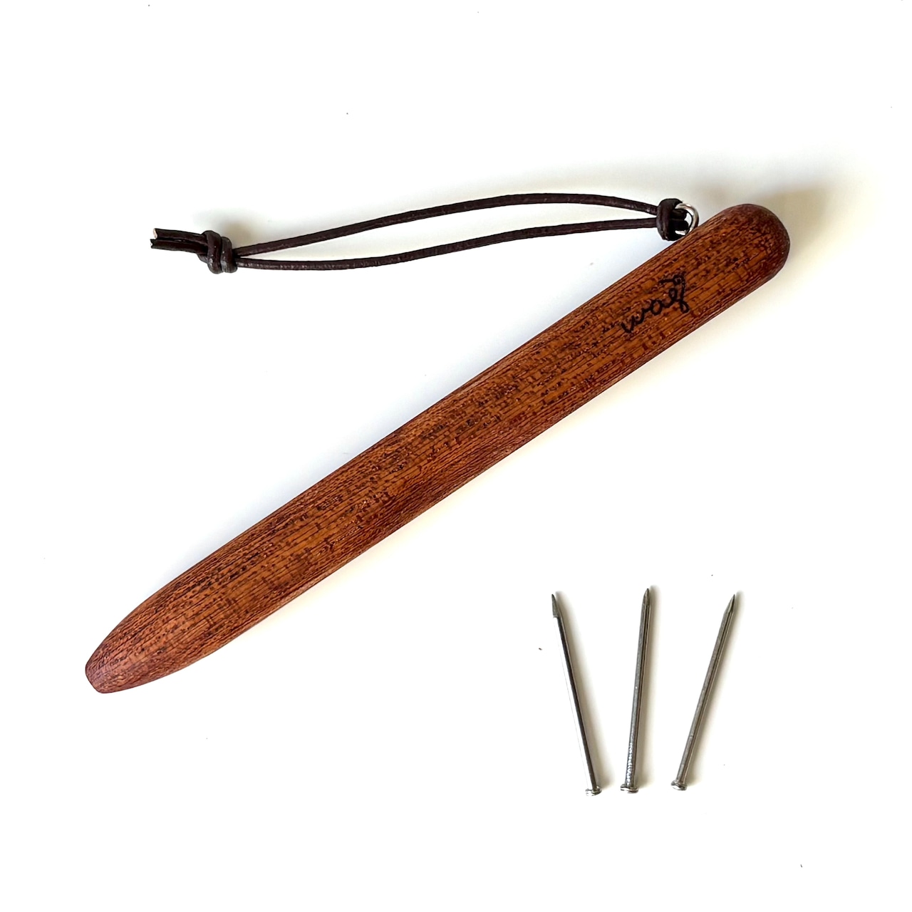 石膏ボードの壁にピンをしっかり押し込むための木製のプッシャーです。